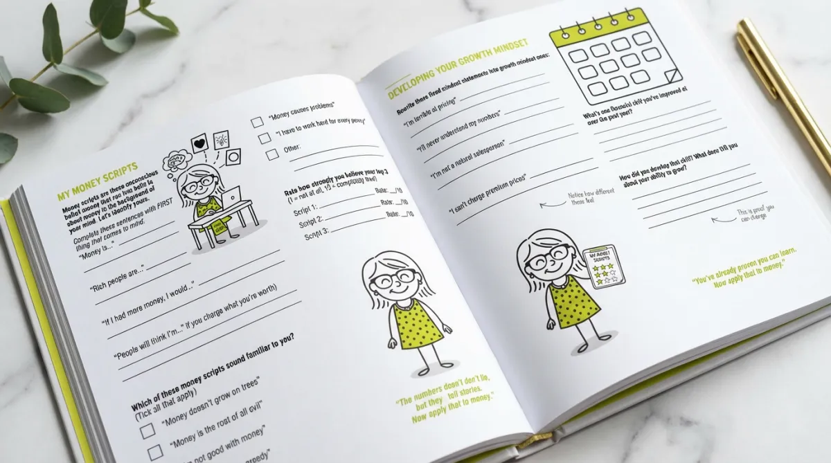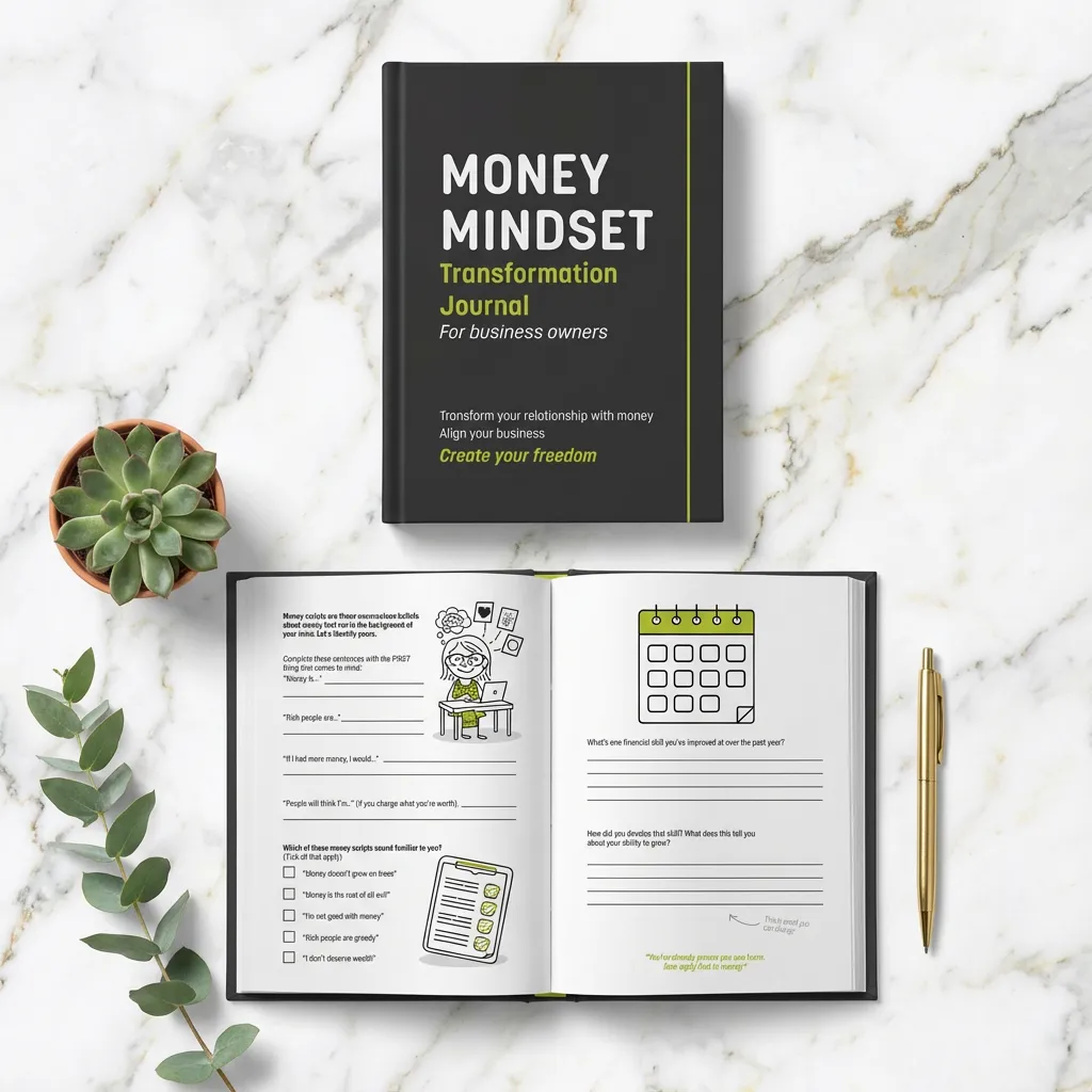A guided, practical workbook designed specifically for business owners. Seven sections take you from uncovering where your money beliefs began, through identifying what's costing you, to building practical systems that stick. No vague mantras. No "just think positive" fluff.
